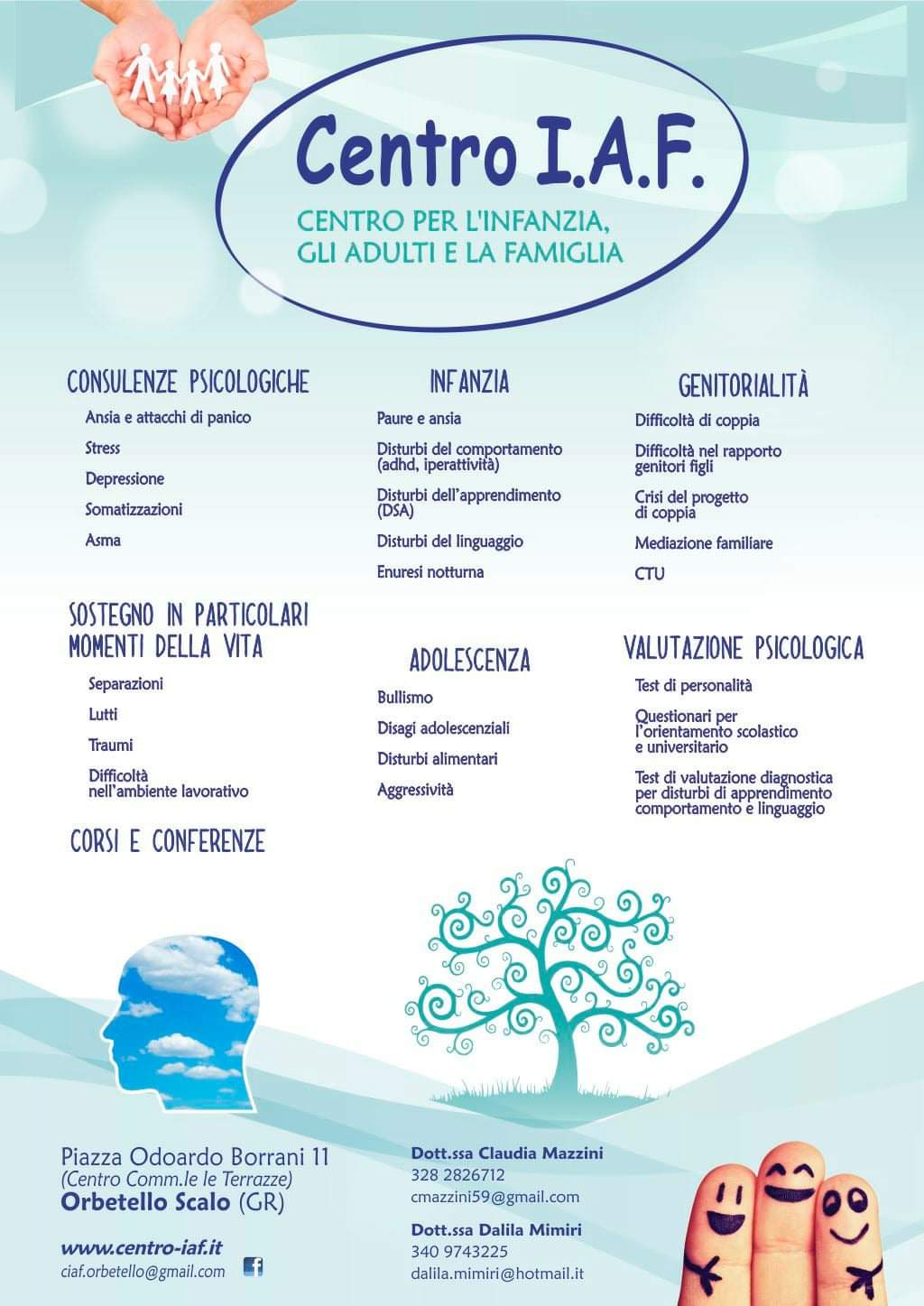 Il Centro I.A.F, (Centro per l’infanzia, gli adulti e la famiglia) è un luogo di consulenza psicologica e formazione che nasce con l’obiettivo di promuovere e contribuire al benessere di minori, adulti, coppie, famiglie e gruppi che vivono disagi personali o dei propri cari.